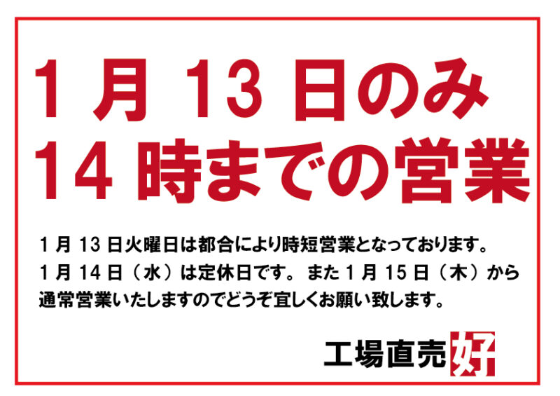 【工場直売好全店】1月13日火曜日は14時までの営業となります 2026年1月12日 工場直売好(ハオ)磯子店・井土ヶ谷店・泉店は、 1月13日(火)のみ、14時までの営業とさせていただきます。 また、1月14日(水)は定休日となり、 1月15日(木)より通常通り営業いたします。 お客様にはご不便をおかけいたしますが、 何卒ご理解のほど、よろしくお願い申し上げます。